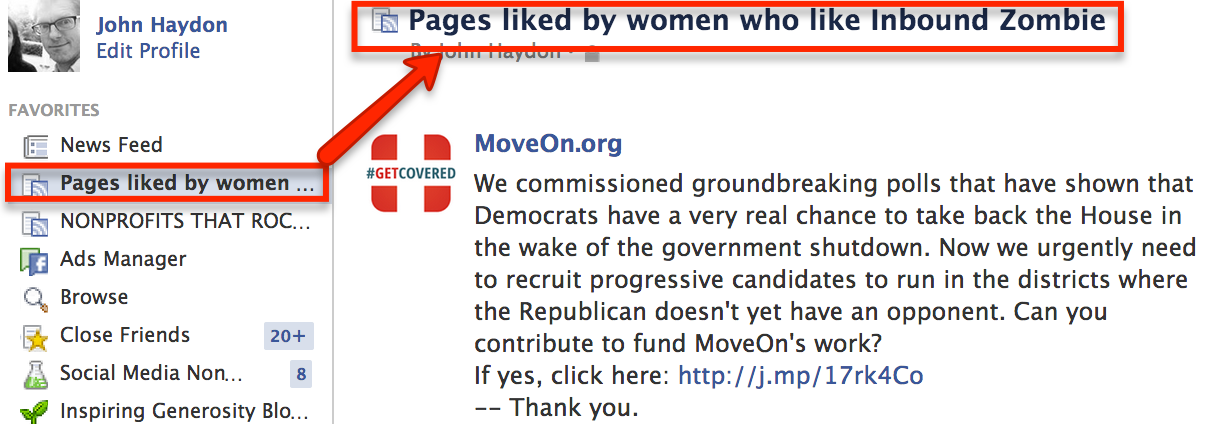 Interest Lists, if you don’t know, are lists of Pages (or people) that Facebook users can create and access from their sidebar (shown below).